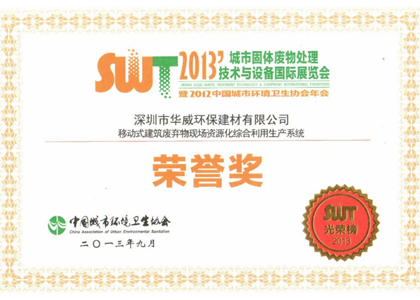 • 城市固體廢物處理技術(shù)與設(shè)備國(guó)際展覽會(huì)榮譽(yù)獎(jiǎng)